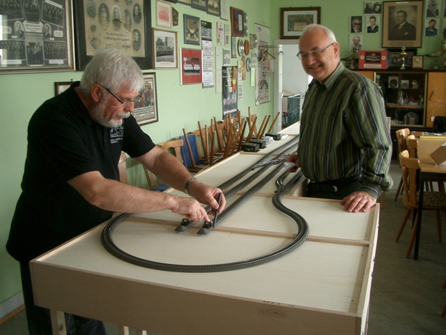 Bild 6 - Rainer und Volker beim Befestigen der Gleise