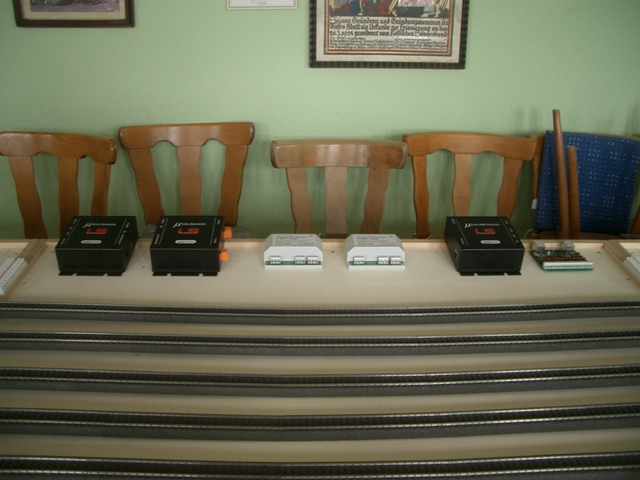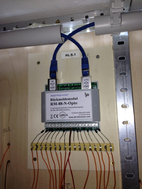 Stephan hat die Gleise an den Rückmeldemodulen komplett verkabelt und die Rückmeldemodule untereinander mit Netzwerkkabel verbunden. Als Rückmeldezentrale verwenden wir den µCon-s88-Master von LSDigital. Dirk unterstützt Stephan bei der Verkabelung der Digitaleinspeisung der Gleise und die Verwendung von Schaltdecodern, da wir unsere Schattenbahnhöfe stromlos schalten wollen, denn das spart kostbaren Digitalstrom.