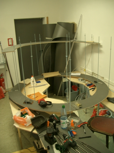 Gleichzeitig wurde der neue Leitstand positioniert und grob vorgebaut. Wir benötigen hier Platz für 6 Monitore, 4 Computer, der Digitalzentrale sowie dem Programmiergleis. Das ganze wird noch eine halbrunde Tischplatte bekommen. Platz für zwei Schreibtischstühle ist auch vorhanden, so dass 2 Clubmitglieder den Leitstand dann bedienen können.