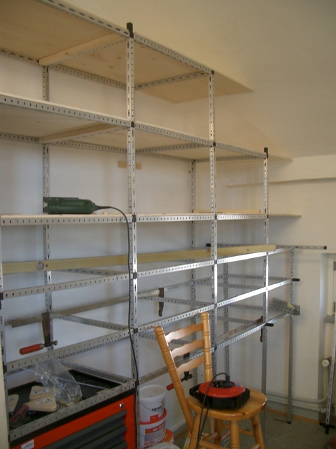 Danach hatte Leo alle drei Ebenen auf der einen Seite fertig montiert. Zusätzlich wurden oberhalb der 3. Ebene Ablagemöglichkeiten geschaffen, und Regalbögen eingezogen. Wir haben ja viel Material, welches verstaut werden muss.