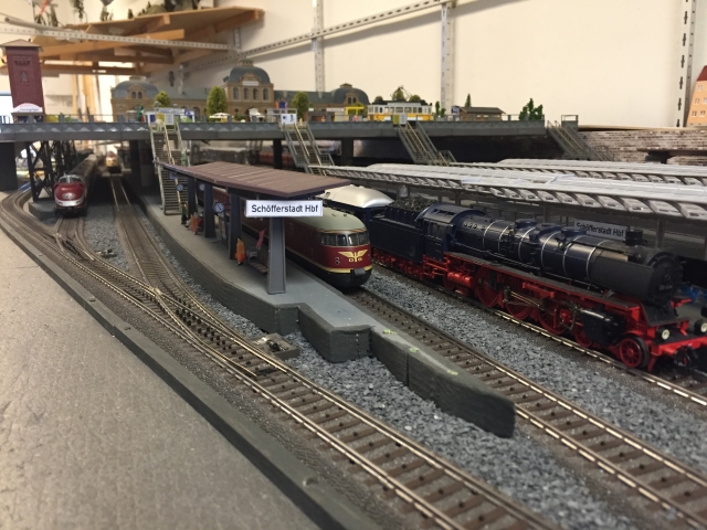 Hier ein Überblick über die Bahnsteige der einen Seite unseres Hauptbahnhofs Schöfferstadt und die Treppen zum Bahnhofsvorplatz. Das sieht doch insgesamt sehr gut aus. Werner ist halt ein Künstler.