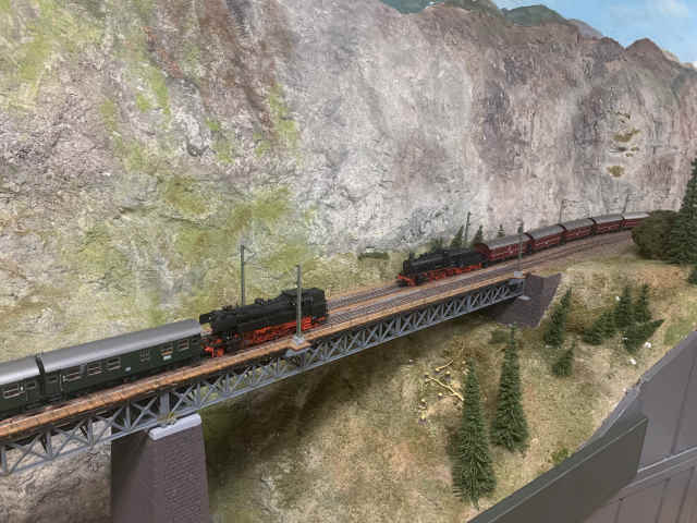 Von daher fahren auch Züge der Epoche III. Hier begegnen sich eine Baureihe 65 und eine Baureihe 56 auf der Brücke der Paradestrecke.