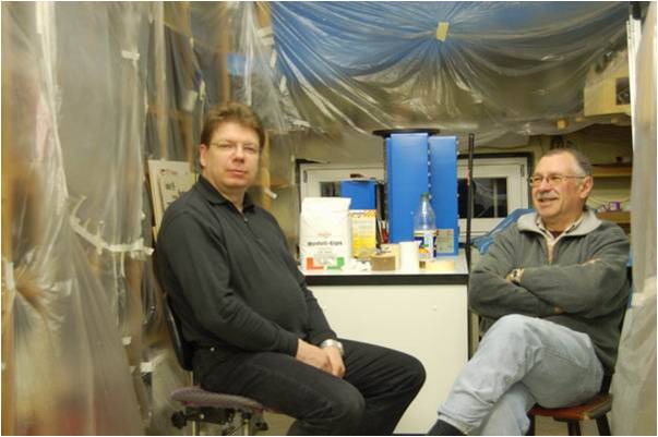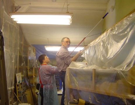 Nun begann das Reinigen, Reinigen, Reinigen und Reinigen. Trotz Folien hatte sich der Staub und der feine Sand überall auf der Anlage verteilt. Hans hatte hier alle Hände voll zu tun. Danach mussten wir die abgebauten Teile wieder einbauen und die Verkabelung wieder zusammengesteckt werden. Außerdem haben wir die Clubräume neu gestrichen.