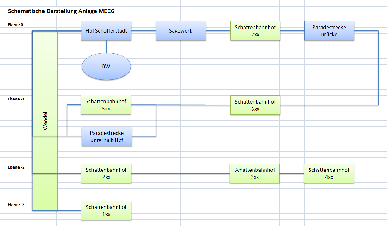 Durch die Neugestaltung der Schattenbahnhöfe haben wir wesentlich mehr Abstellmöglichkeiten für unsere große Anzahl von Zügen. Wir haben hier Sack-Schattenbahnhöfe für lange und kürzere wendefähigen Züge, sowie durchgängige normale Schattenbahnhöfe für lange und kürzere nicht wendefähigen Züge. Ein Gleiswendel dient zum Befahren der verschiedenen Ebenen, von denen wir insgesamt vier Stück haben. Der Gleiswendel ist das "Herzstück", durch den alle Züge durchfahren müssen. Dieser stellt zwar einen Engpass für den Zugbetrieb dar, dafür müssen wir langsame Züge jetzt nicht mehr durch die gesamte Anlage fahren lassen, sondern können sie gezielt in bestimmte Abschnitte fahren und abstellen lassen. Allein dies ist ein sehr grosser Vorteil, gegenüber dem alten Gleisplan.