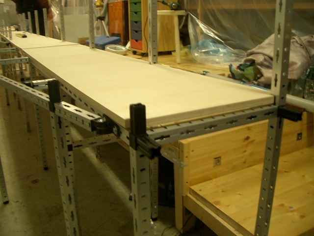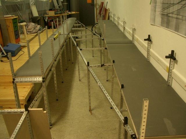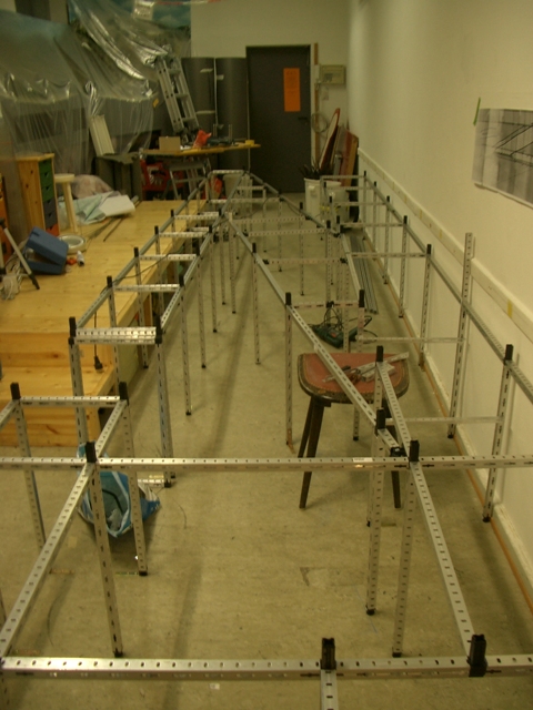 Nach der Leere in unseren Räumen stand der Wiederaufbau an. Wir haben uns entschieden, kein Holz mehr sondern Vierkant-Aluprofile als Unterkonstruktion zu verwenden. Dies ist sehr stabil und arbeitet nicht mehr, so wie unsere alte Holzkonstruktion. Wir verwenden auf der Unterkonstruktion 18mm starke Multiplexplatten und haben diese mit einer Art "Moosgummi" zur Geräuschdämmung beklebt. Darauf haben wir die K-Gleise mit Nägeln befestigt.