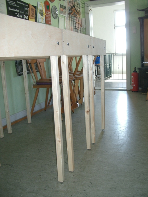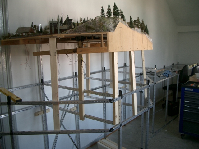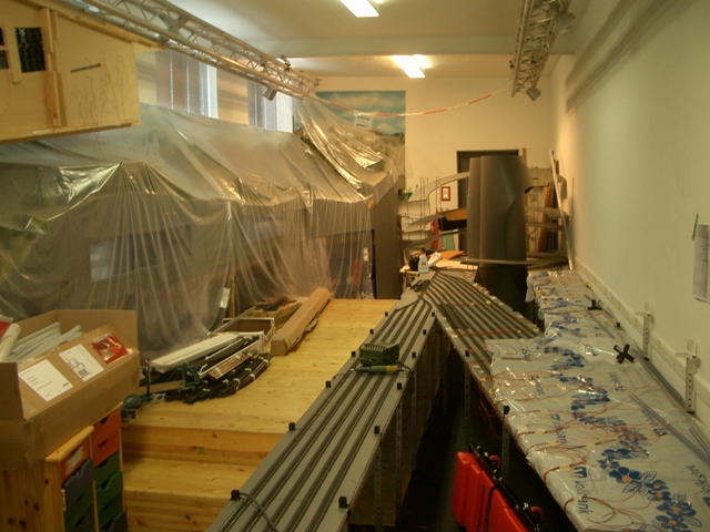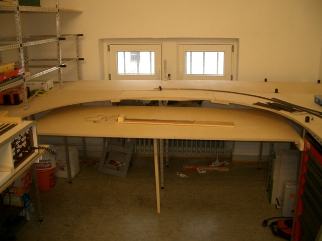 Der Bau der neuen Anlagenunterkonstruktion wurde im hinteren Clubraum weiter fortgeführt. Wir haben leider kleinere Rollen an unseren Werkzeugwagen befestigen müssen, damit diese unter der Anlage platziert werden können. Die neuen Rollen sehen ganz witzig aus; sie erfüllen aber ihren Zweck. Der Platz auf der Anlage wurde gleich wieder zur Ablage missbraucht.