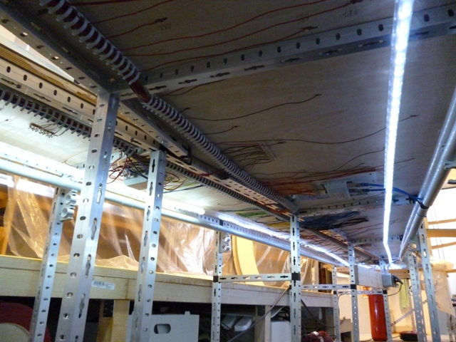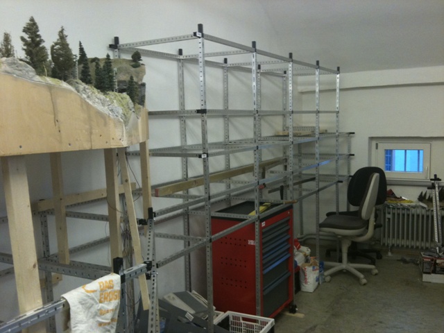 Danach hatte Leo alle drei Ebenen auf der einen Seite fertig montiert. Zusätzlich wurden oberhalb der 3. Ebene Ablagemöglichkeiten geschaffen, und Regalbögen eingezogen. Wir haben ja viel Material, welches verstaut werden muss.