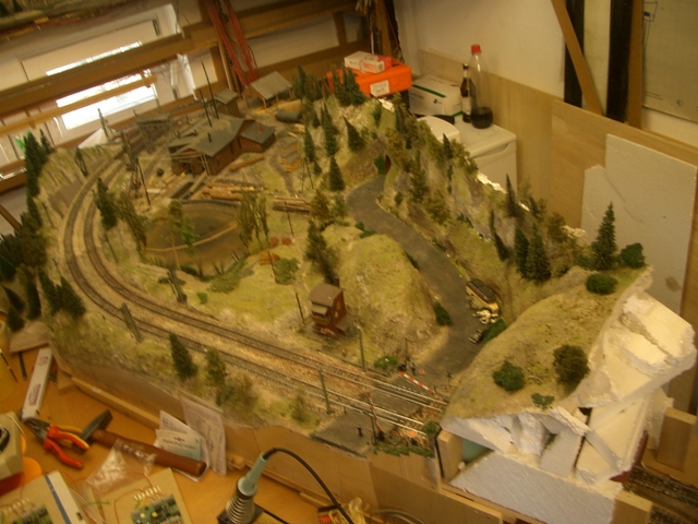 Die ersten Arbeiten am Gleiswendel wurden durchgeführt. Das Gestänge wurde positioniert. Die Halbrundungen aus Holz ausgeschnitten, die erste Rundungen mit Moos beklebt und dann in den Wendel eingelassen.