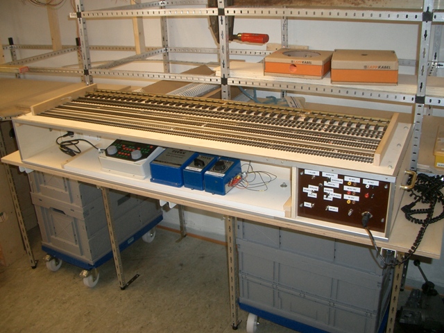 Rainer hat einen neue Testprüfstand für die verschiedenen Spuren gebaut und entsprechend verkabelt, so dass wir Loks sowohl digital als auch analog testen können. Der Vorteil gegenüber dem alten Prüfstand ist, dass dieser deutlich leichter ist und übersichtlicher zu bedienen ist. Rainer hat auch gleich einen Ausgang für unser Proxxon-Werkzeug noch mit eingebaut.