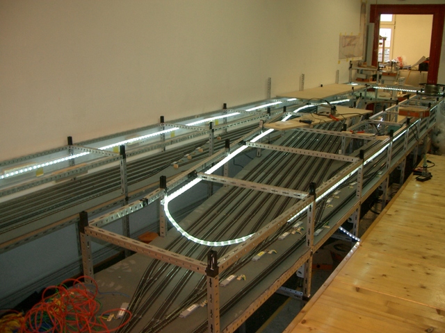Danach wurde auch gleich die Leuchtleisten für diesen Abschnitt verlegt, so dass wir auch genügend Licht für den Schattenbahnhof bekommen.
