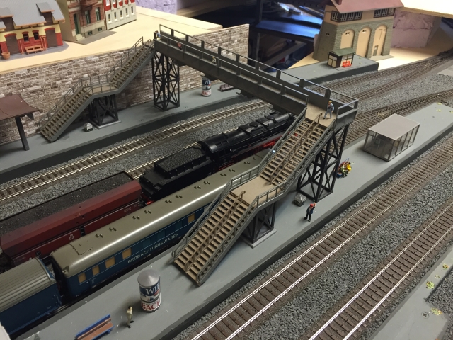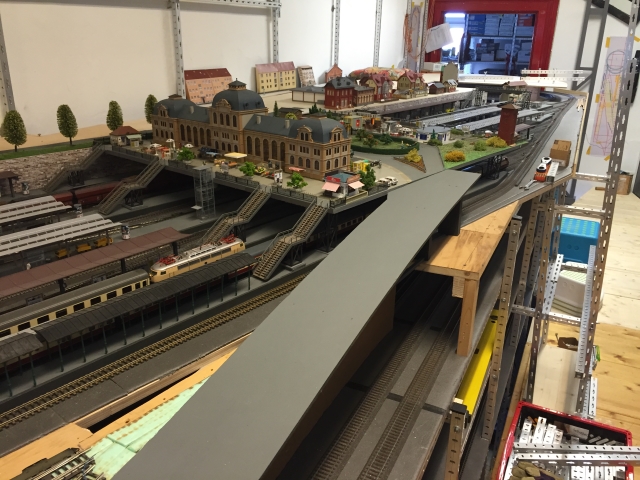 Hierfür war es erforderlich, dass eine Brücke über die Gleise vom Wendel zum Hauptbahnhof Schöfferstadt führt. Zum Bau der Brücke hat Volker eine Woche Zeit benötigt. Sie sieht sehr gelungen aus und könnte glatt mit einer Brücke aus dem Miniatur-Wunderland konkurrieren.