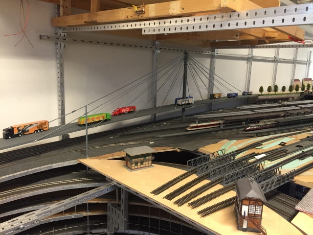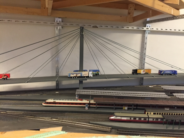 Auf diesem Bild ist der Verlauf der Straße von der Stadt und der Brücke sehr gut einzusehen. Volker hat hier sehr genau gemessen, so dass die Brücke auch die erforderliche Höhe hat, damit die Züge nicht hängen bleiben.