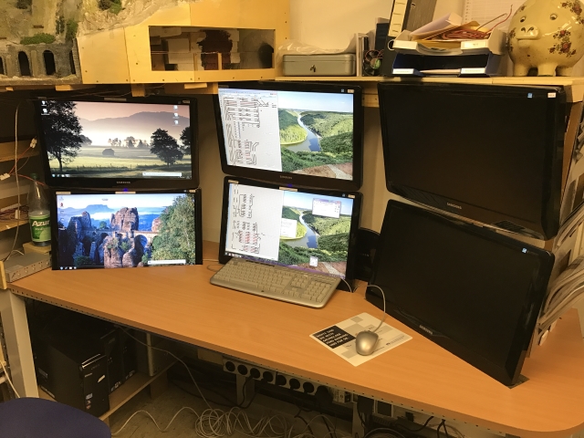 Helmut und Volker haben sich einen neuen Standort ausgesucht, der Leitstand wurde um 90 Grad gedreht und an die Wand gestellt. Helmut hat hierzu eine neue Arbeitsplatte gebaut und Helmut und Volker haben alle sechs Monitore entsprechend montiert. Stephan hat die neuen Computer angeschlossen und Volker hat die Verkabelung zur Anlage entsprechend ergänzt.