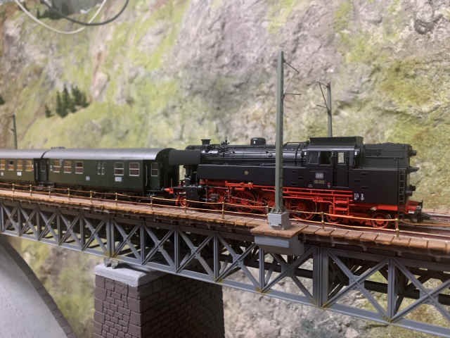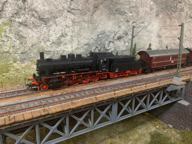 Von daher fahren auch Züge der Epoche III. Hier begegnen sich eine Baureihe 65 und eine Baureihe 56 auf der Brücke der Paradestrecke.