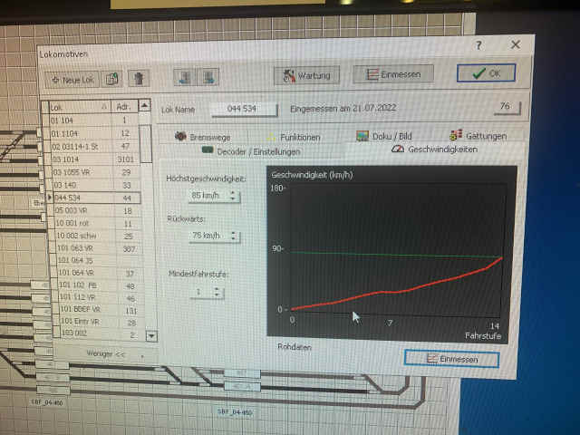 Beim Einmessen wurde nun auch die maximale Geschwindigkeit der Loks und die maximale Streckengeschwindigkeit berücksichtigt, so dass wir nun alle Fahrstufen der Loks nutzen können. Dies kann man sehr schön an der Geschwindigkeitskurve der Baureihe 044 sehen.