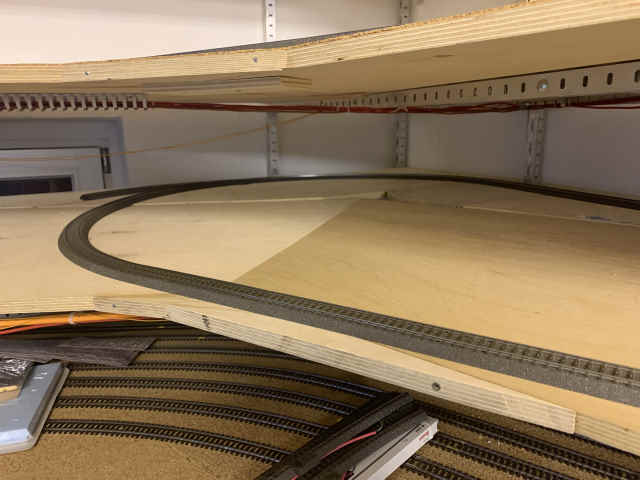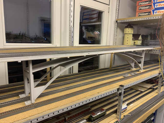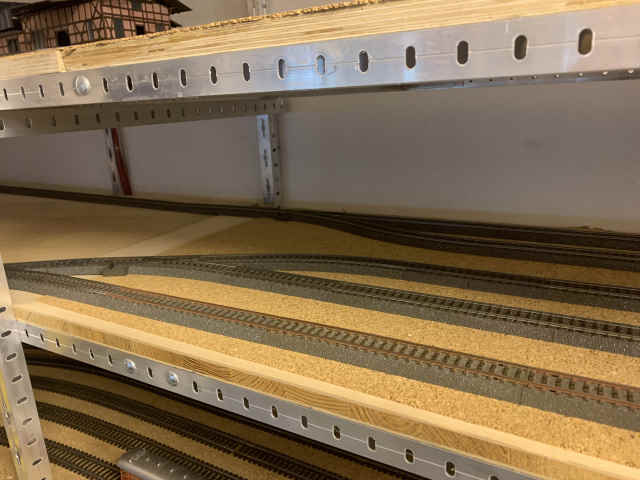 Volker hatte bereits im Dezember hunderte Gleise und ein paar Weichen verlegt und eine Verbindung vom Bahnhof Schöfferstadt, durch den hinteren Raum, zur Paradestrecke und dann wieder zurück zum hinteren Raum mit einer Kehrschleife zurück zur Paradestrecke und dann zum Bahnhof Schöfferstadt geschaffen.
