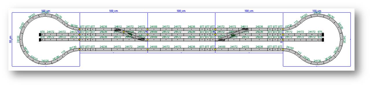 Wir können mit dieser Alternative eine normalen Zugbetrieb mit einer Bahnhofssteuerung durchführen. Gleichzeitig ist auch Pendelbetrieb möglich. Der untere mittlere Gleisabschnitt dient wieder zum Einmessen der Loks.